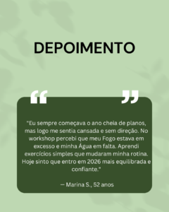 Um workshop vivencial para linhar Fogo, Terra, Ar e Água dentro de você para renovar sua energia vital, destravar a prosperidade e entrar no novo ano com plenitude, clareza e poder de realização.